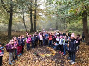 Bei nebligem Wetter wanderten die Kinder, Lehrerinnen und begleitende Eltern der 1b und 2b gemeinsam auf den Auberg. Auf dem Weg wurde eine Blätterschlange gesichtet, eine riesige Blätterschacht gemacht, viele Pilze, Pflanzen und Tiere entdeckt und natürlich auch jede Menge Dinge gesammelt. Die fröhlichen Wanderer besuchten die Bildereiche um eine Pause zu machen, wo sie auch wieder am Holzhaufenhaus weiterbauten. Es wurde Fangen und Verstecken gespielt. Beim Rückweg ging es steil bergab, ein Stück den Kreuzweg entlang, über eine Wiese, durch den Wald in einen Hohlweg und dann auf die Kellergasse, wo es noch Weintrauben und Nüsse gab. Trotz des langen Weges kamen alle gut gelaunt wieder bei der Schule an. Die versprochene Sonne zeigte sich leider erst am Nachmittag.