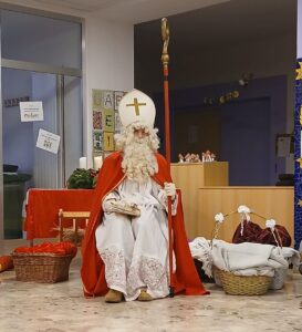 Am Nikolaustag überraschte uns der Heilige Nikolaus mit seinem Besuch. Er freute sich sehr über ein Gedicht und ein Lied und beschenkte die Kinder und auch die Lehrer*innen unserer Schule mit einem Nikolaus aus Germteig, den sich alle in der Pause gut schmecken ließen.