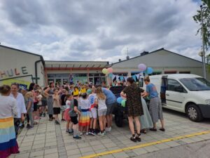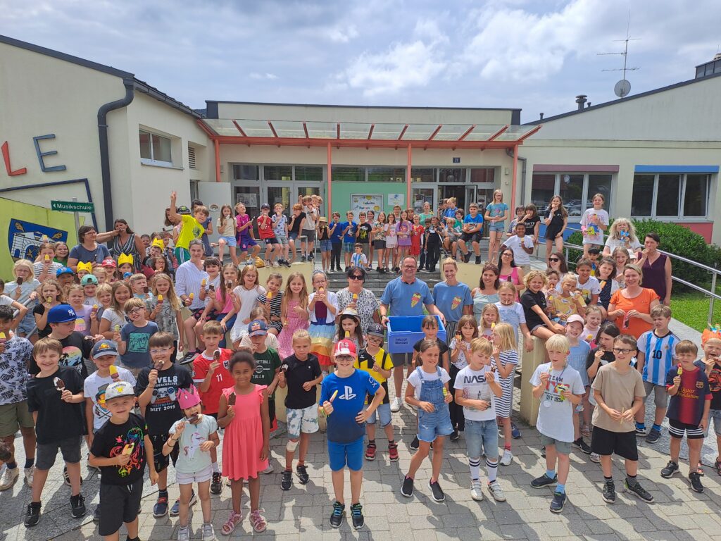Auch heuer überraschte unser Herr Bürgermeister die Kinder mit einem Eis zum Schulabschluss. Nach einem kräftigen Dankes-Applaus für unseren Eismann und seine Helferinnen ließen wir uns das Eis im Schulgarten gut schmecken.